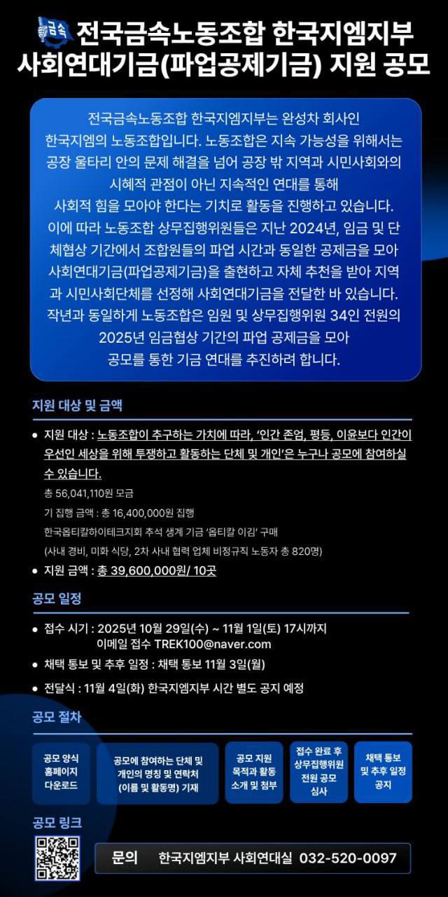 □ 전국금속노동조합 한국지엠지부는 완성차 회사인 한국지엠의 노동조합입니다. 한국지엠지부 상무집행위원들은 지난 2024년, 임금 및 단체협상 기간 중 조합원들의 파업 시간과 동일한 공제금을 모아 사회연대기금(파업공제기금)을 출연하고 자체 추천을 받아 지역과 시민사회단체를 선정해 사회연대기금을 전달한 바 있습니다. 올해도 작년과 동일하게 한국지엠지부는 임원 및 상무집행위원 34인 전원의 2025년 임금협상 기간의 파업 공제금을 모아 공모를 통한 기금 연대를 추진하려 합니다.