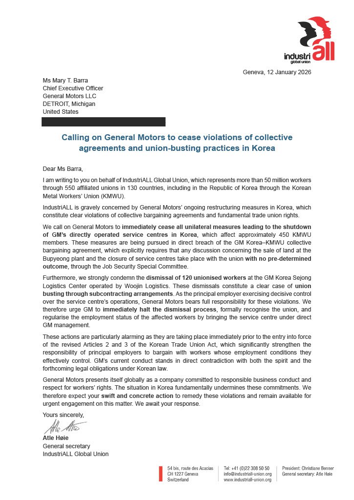 ○ 130개국 550개 가맹 노동조합을 통해 5천만명 이상의 노동자를 대표하는 인더스트리올(국제통합제조산별노련, IndustriALL Global Union)의 아틀레 호이 사무총장이 제너럴모터스(GM) 메리 T. 바라 대표이사에게 한국지엠 직영 서비스 센터 폐쇄 및 집단해고를 즉각 중단하라는 서한을 12일 보냈다.