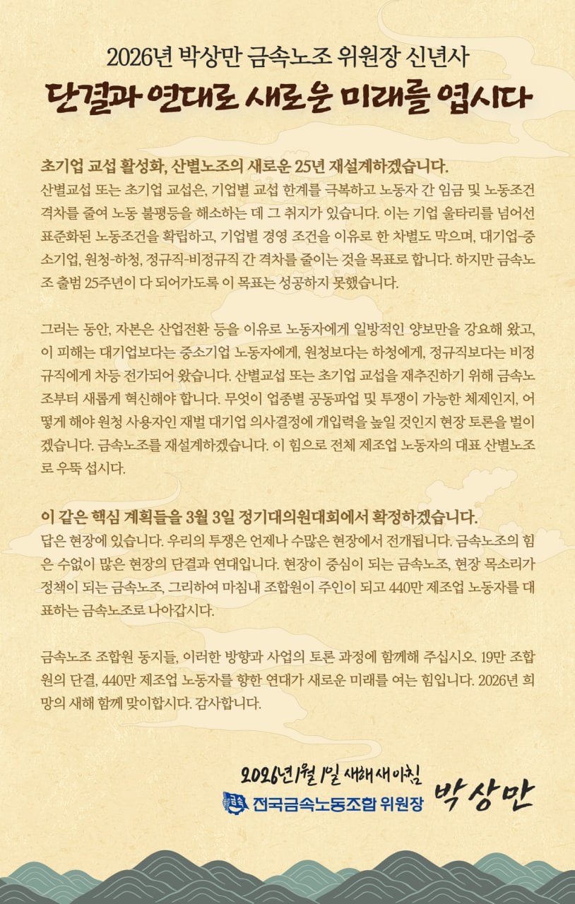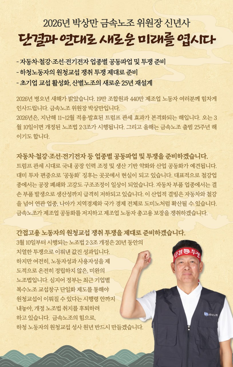 2026년 병오년 새해가 밝았습니다. 18만 조합원과 440만 제조업 노동자 여러분께 힘차게 인사드립니다. 금속노조 위원장 박상만입니다.