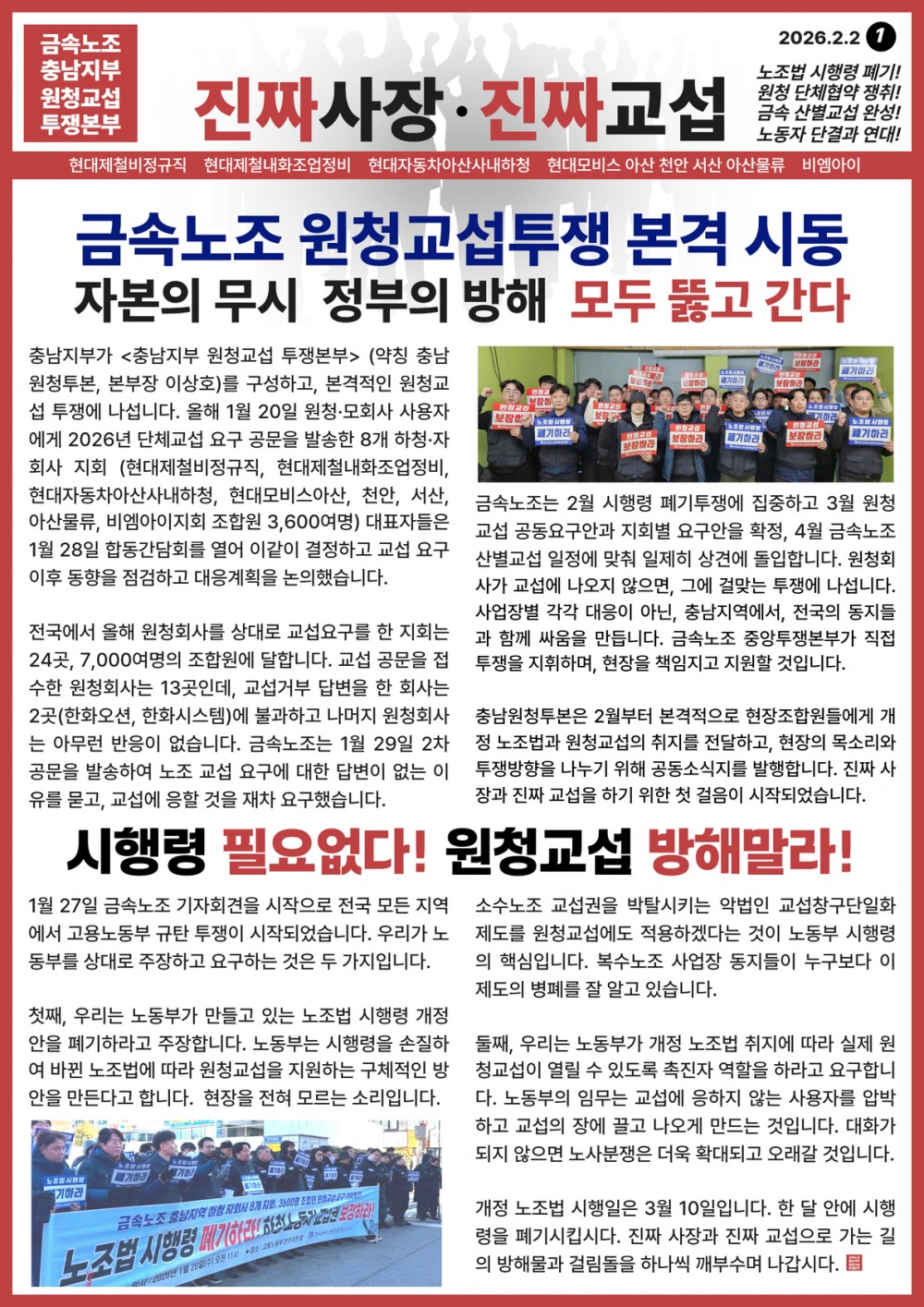 [충남원청투본] 1호 금속노조 원청교섭투쟁 본격 시동 페이지 정보 작성자 충남정책 작성일26-02-02 07:29 조회4회 댓글0건 관련링크 본문 충남지부 원청교섭 투쟁본부 소식지 1호 2026.2.2 목록