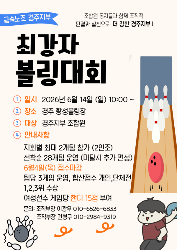 2026년 경주지부 조합원 참여사업 볼링대회 페이지 정보 작성자 경주지부관리자 작성일26-03-26 10:33 조회26회 댓글0건 본문 2026년 경주지부 조합원 참여사업 볼링대회 이전글 다음글 목록