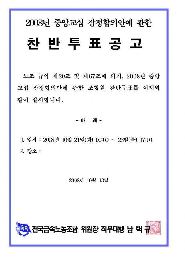 공고]2008년 중앙교섭 잠정합의안 찬반투표 공고