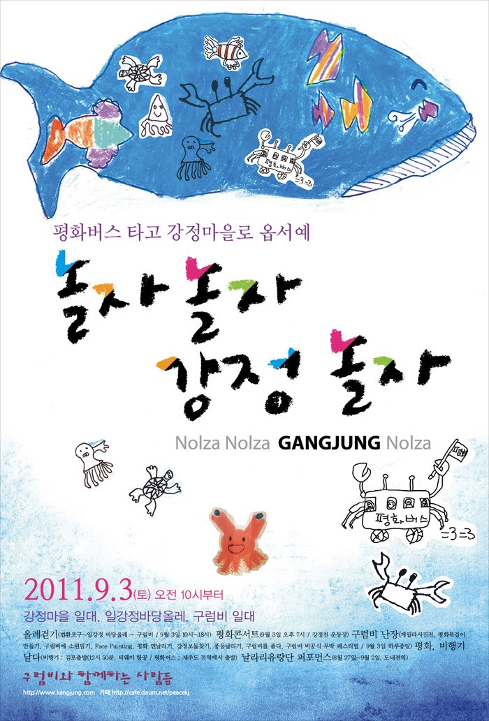 제주 강정마을과 구럼비 해변을 지키는 평화의 비행기가 뜹니다. 강정을, 제주올레 7코스를 사랑하는 사람들 모두가 제안하는 평화의 비행기 입니다. 자본과 권력의 횡포를 이겨내고 행복의 소금꽃을 피워낸 희망의 버스에 이어, 군함과 대포를 쫓아내고 사람꽃을 피워 낼 평화의 비행기가 출발합니다. 2011년 9월 3일(토) 오후 12시 50분 김포공항에서 제주 강정마을을 향해 평화의 비행기가 날아갑니다. 제주 올레길 중 가장 아름답다는 제주올레 7코스도 함께 걷고, 구럼비 해변에서 신명나는 평화 콘서트도 즐기고자 합니다.