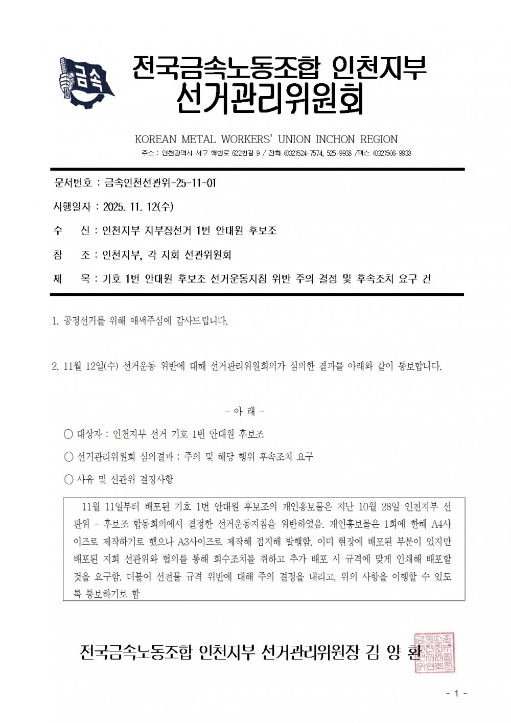 [선관위] 기호 1번 안대원 후보조 선거운동 위반에 대한 주의 결정 및 후속조치 요구 건 페이지 정보 작성자 인천지부 작성일25-11-12 09:39 조회4회 본문 11월 12일 선관위 회의를 통해 결정된 사항을 알립니다. 다음글 목록