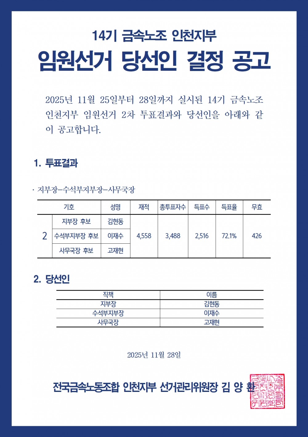 [선관위] 14기 인천지부 임원선거 당선인 확정 공고