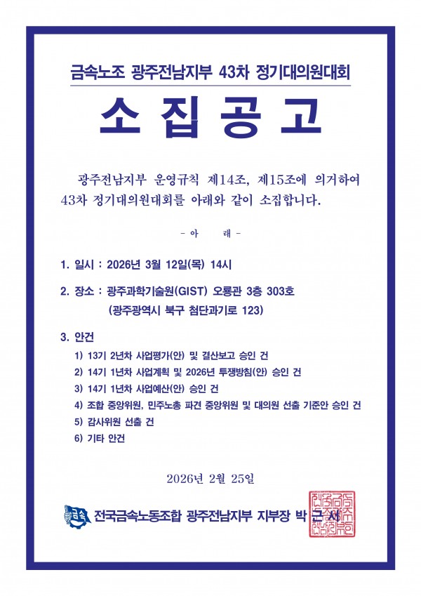 금속노조 광주전남지부 43차 정기대의원대회 공고