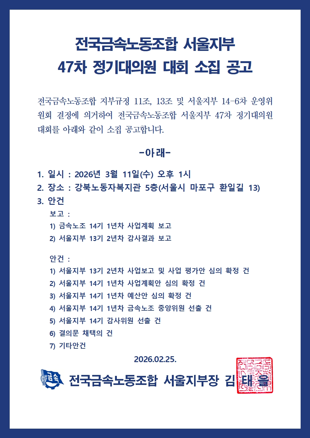 서울지부 47차 정기대의원대회 소집공고입니다. 페이지 정보 작성자 서울지부 작성일26-02-25 14:15 조회25회 본문 서울지부 47차 정기대의원대회 소집공고 이전글 다음글 목록