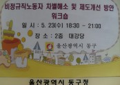 2012. 5. 23 비정규직노동자 차별해소 및 제도 개선 방안 워크숍 (동구청) 동구 비정규직센터에서 주관한 워크숍에 참가하였다.