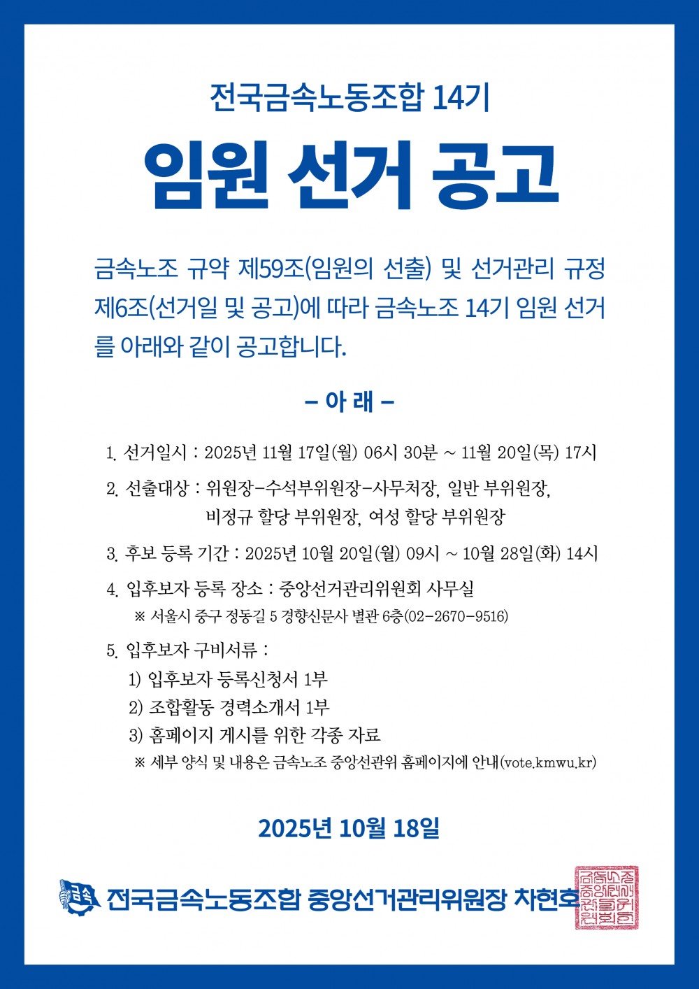 [공고] 14기 임원 선거 공고 페이지 정보 작성자 총무실 작성일25-10-18 10:20 조회84회 첨부파일 251018_임원선거공고.pdf (974.1K) 4회 다운로드 DATE : 2025-10-18 10:20:51 본문 [공고] 14기 임원 선거 공고입니다. 목록